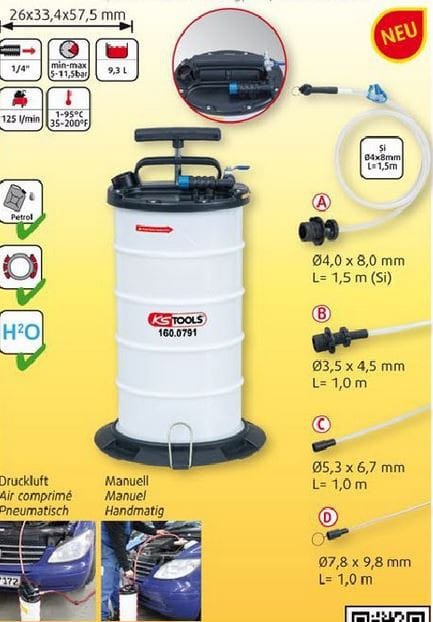 Kstools 160.0790 Alipaine-imupumppu. Tällä vaihdat moottoriöljyt, pakkasnesteet, ilmaat jarrut yksin. Todellinen korjaamon monitoimilaite.
