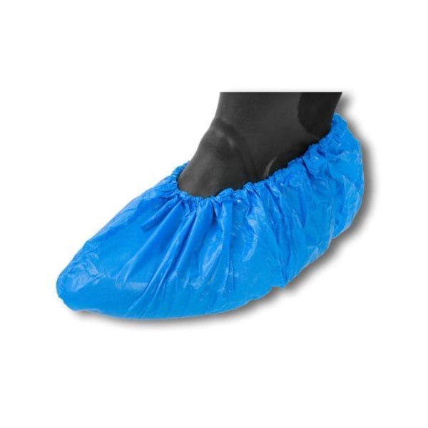 Sininen muovinen kengänsuoja joustavalla kuminauhalla.